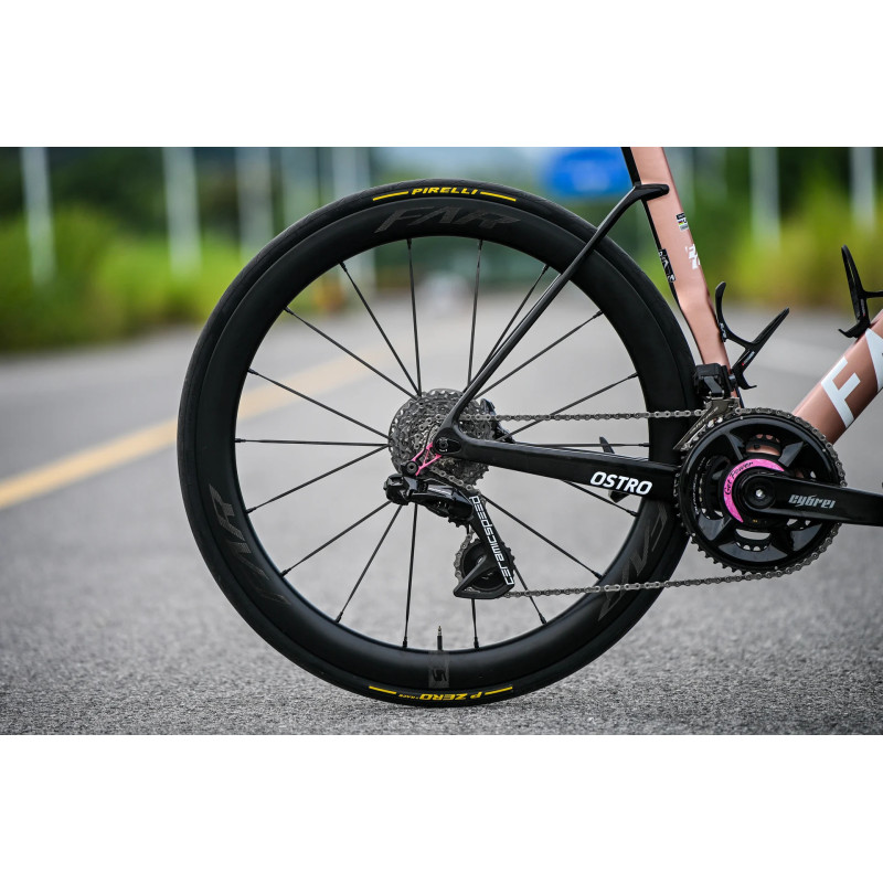The hooked carbon rim is tubeless-ready and clincher compatible, featuring a 24 mm internal width and 31.5 mm external width, improving tire support, lowering rolling resistance and enhancing stability in crosswinds.