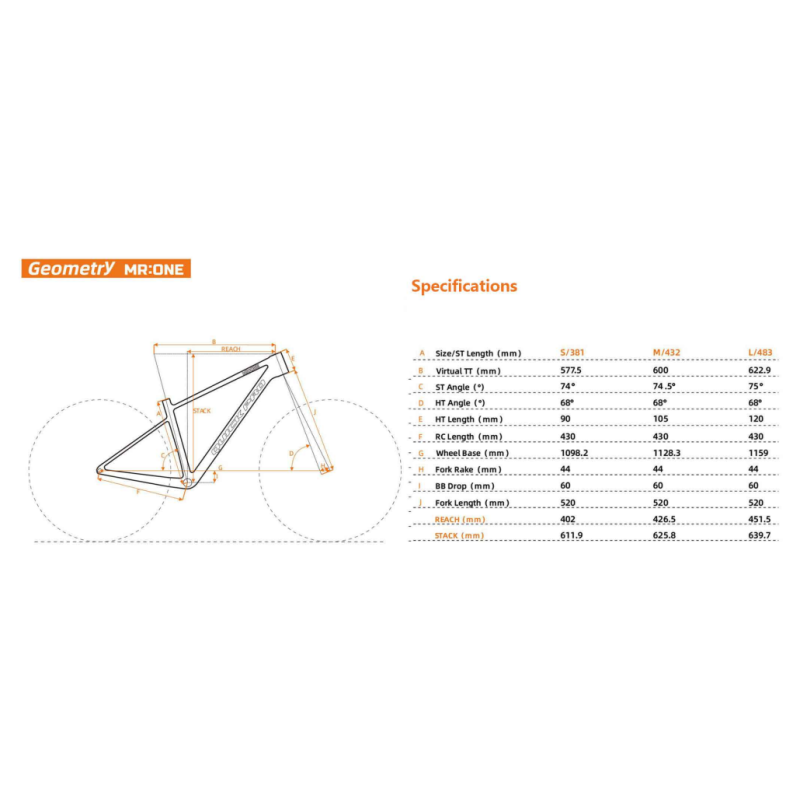 Avec un poids d’environ 889 g ±5 % (taille M, peinture incluse), le MR:ONE permet de construire un vélo léger sans compromis sur la rigidité. Sa géométrie équilibrée assure une stabilité rassurante, un pilotage précis et une excellente transmission de puissance, aussi bien sur terrain vallonné que sur parcours roulants.